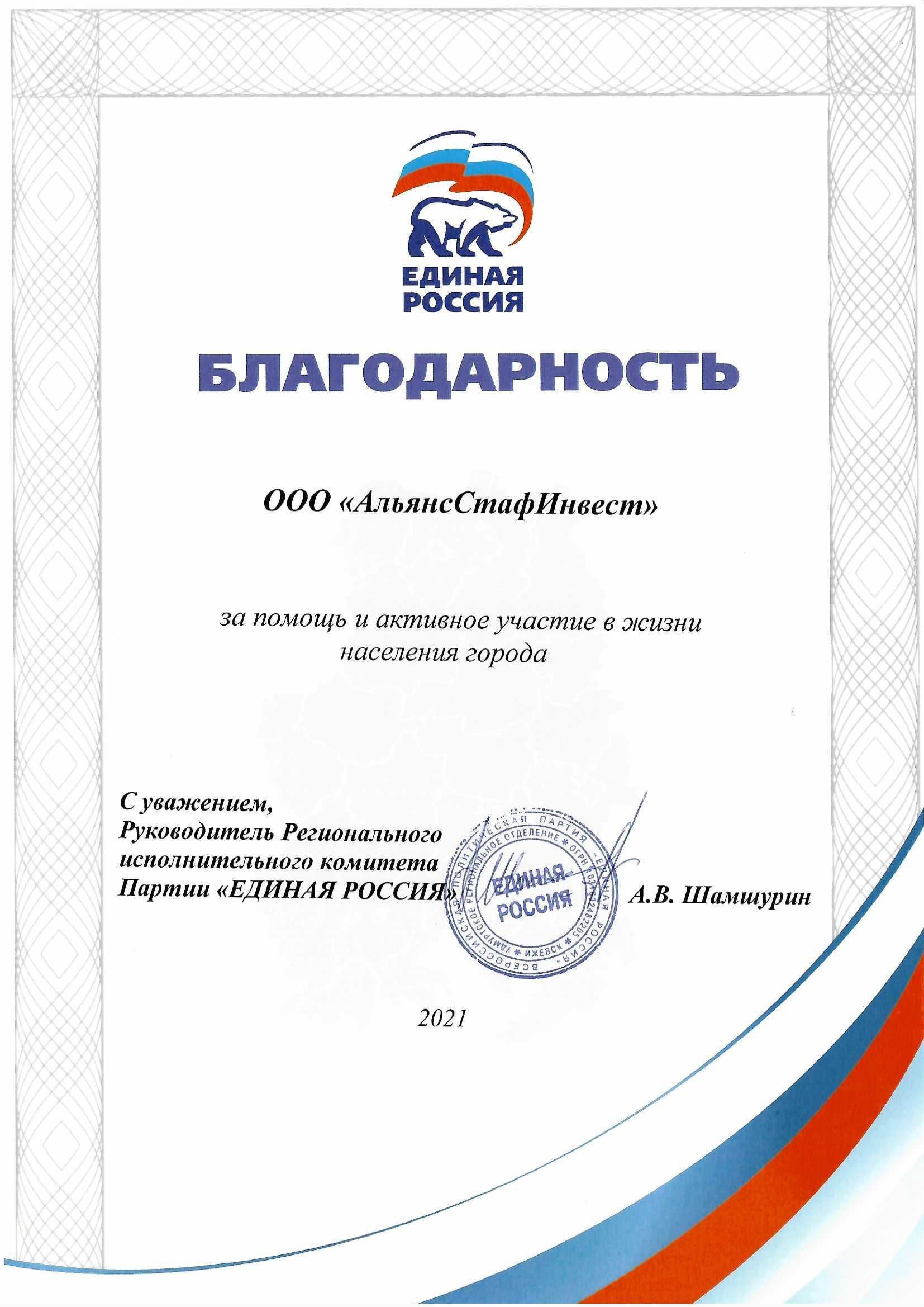 Благодарность от партии Единая Россия, выраженная в письме ООО "АльянсСтафИнвест" за помощь и активное участие в жизни населения города.